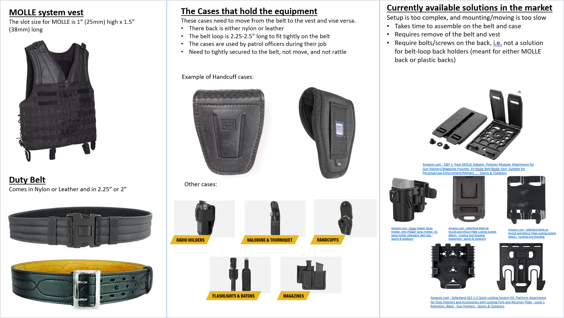 product design market research disassembler researchTo expand our product offering with a new adapter to allow police officers to move equipment from their duty belt to the duty vest. The adapter will fit into the belt-loop of equipment cases (such handcuff cases), will mount on a belt easily, and can be released and remounted on a vest. Current products in the market do not deliver on the benefits above - they are cumbersome and slow and complex requiring disassembly of belt and other cases.